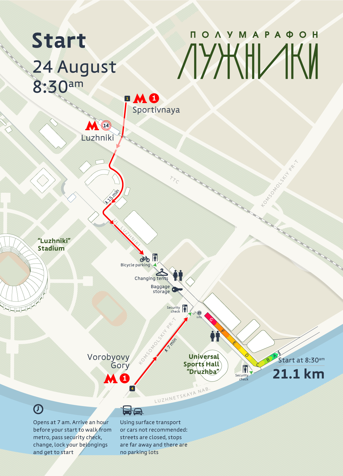 A letter of your start corral is indicated on race number. Look for the corresponding letter signs to get into your corral. Runners are allowed only with the race number.